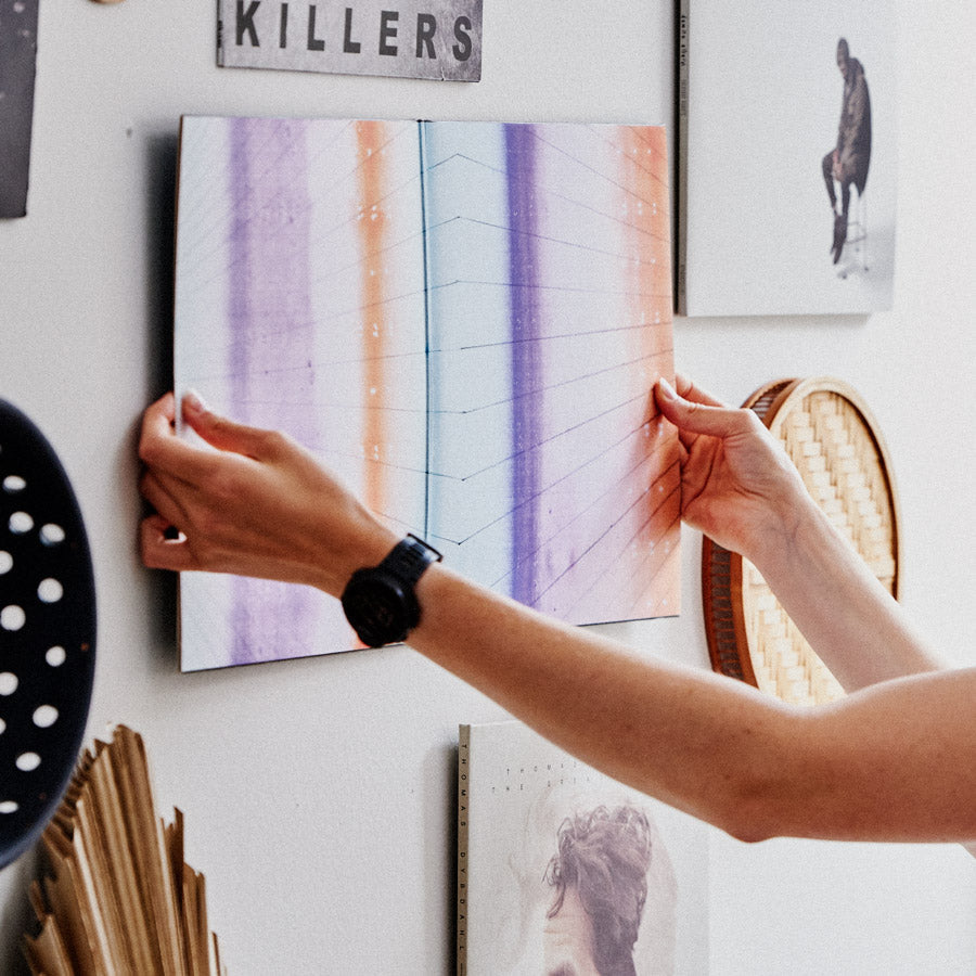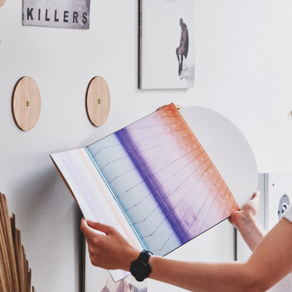 Hold the album up against the wall magnets. Adjust and carefully let go of the album. Et voila, your album is now displayed on the wall.