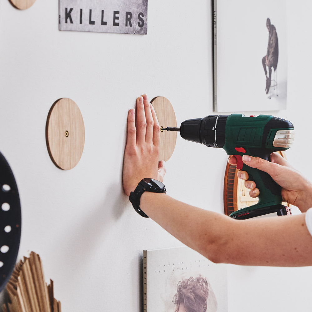 Attach the magnetic discs to your wall with the included screws. Use suitable raw plugs.
